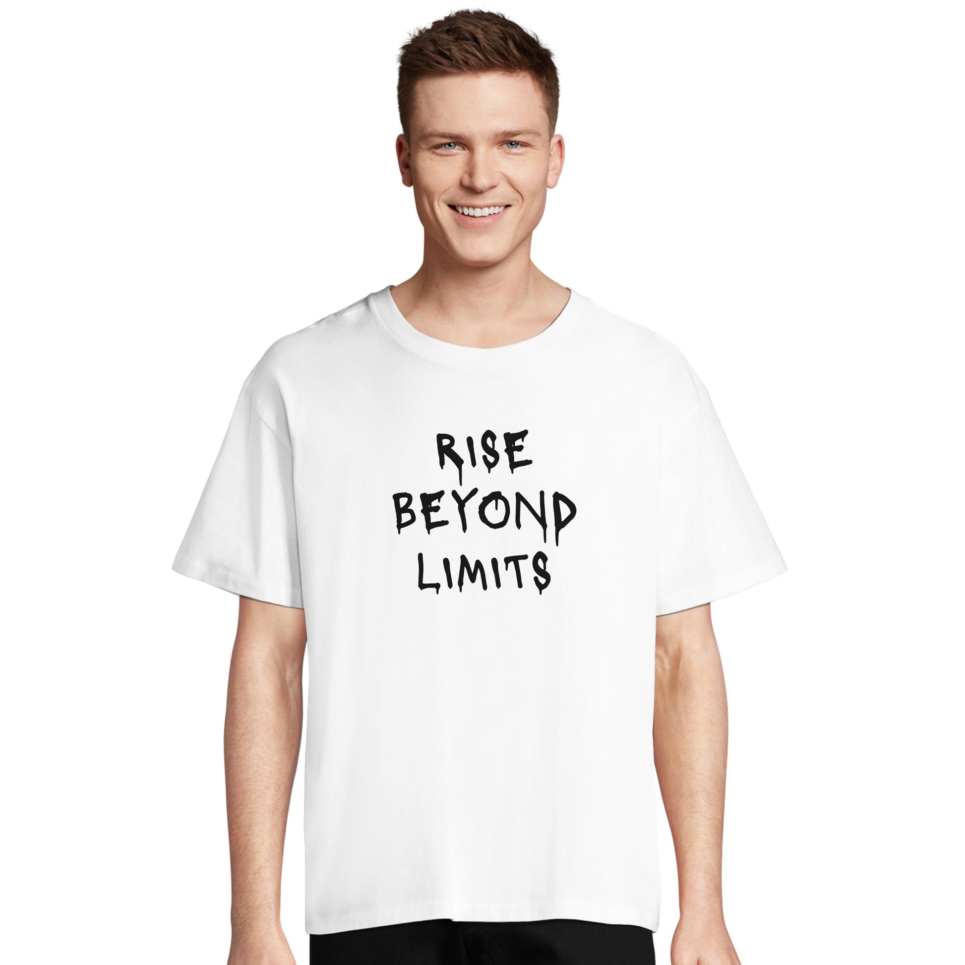 Sur le torse, l’inscription "Rise Beyond Limits" affirme une vision : celle d’un être qui ne se contente jamais de ce qu’on lui donne, mais qui vise plus haut, toujours plus loin. Disponible en noir ou en blanc, ce t-shirt oversize mêle confort cosmique et puissance intérieure.